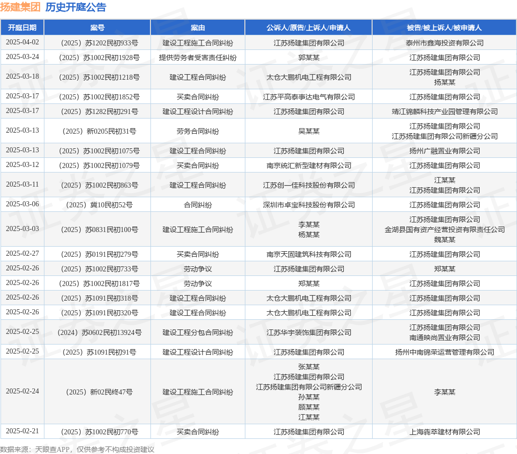 本站消息,根据天眼查APP显示,近日公布了一则江苏扬建集团有限公司作为原告/上诉人的开庭公告,详细内容如下: